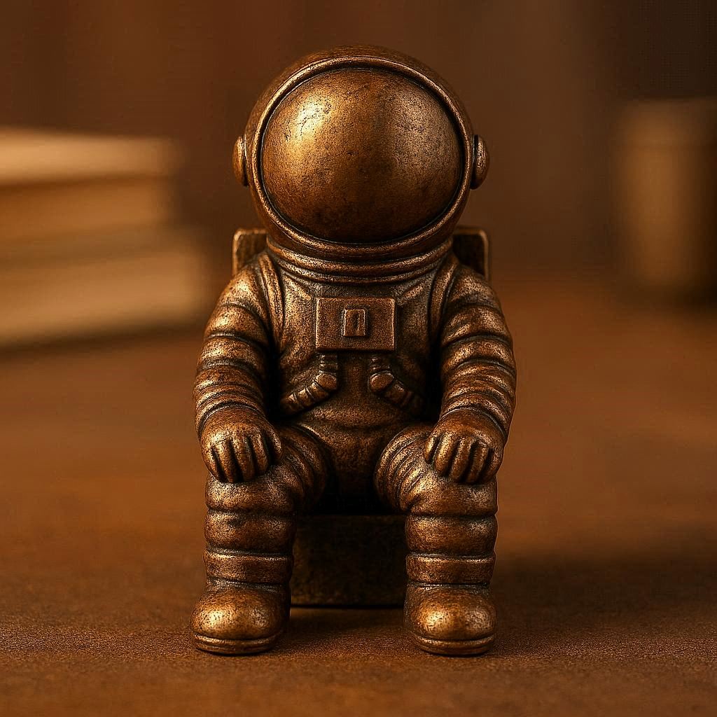 This meticulously detailed, lost-wax-cast bronze sculpture depicts a seated astronaut in a moment of contemplation, holding a tiny, removable helmet. Its rich patina and solid weight give it a substantial, heirloom feel. At just 3 inches tall, it serves as a powerful symbol of curiosity, exploration, and dreaming big. Perfect for the desk of a scientist, engineer, writer, or anyone who looks to the stars for inspiration. A conversation-starting piece that adds depth and narrative to any workspace.