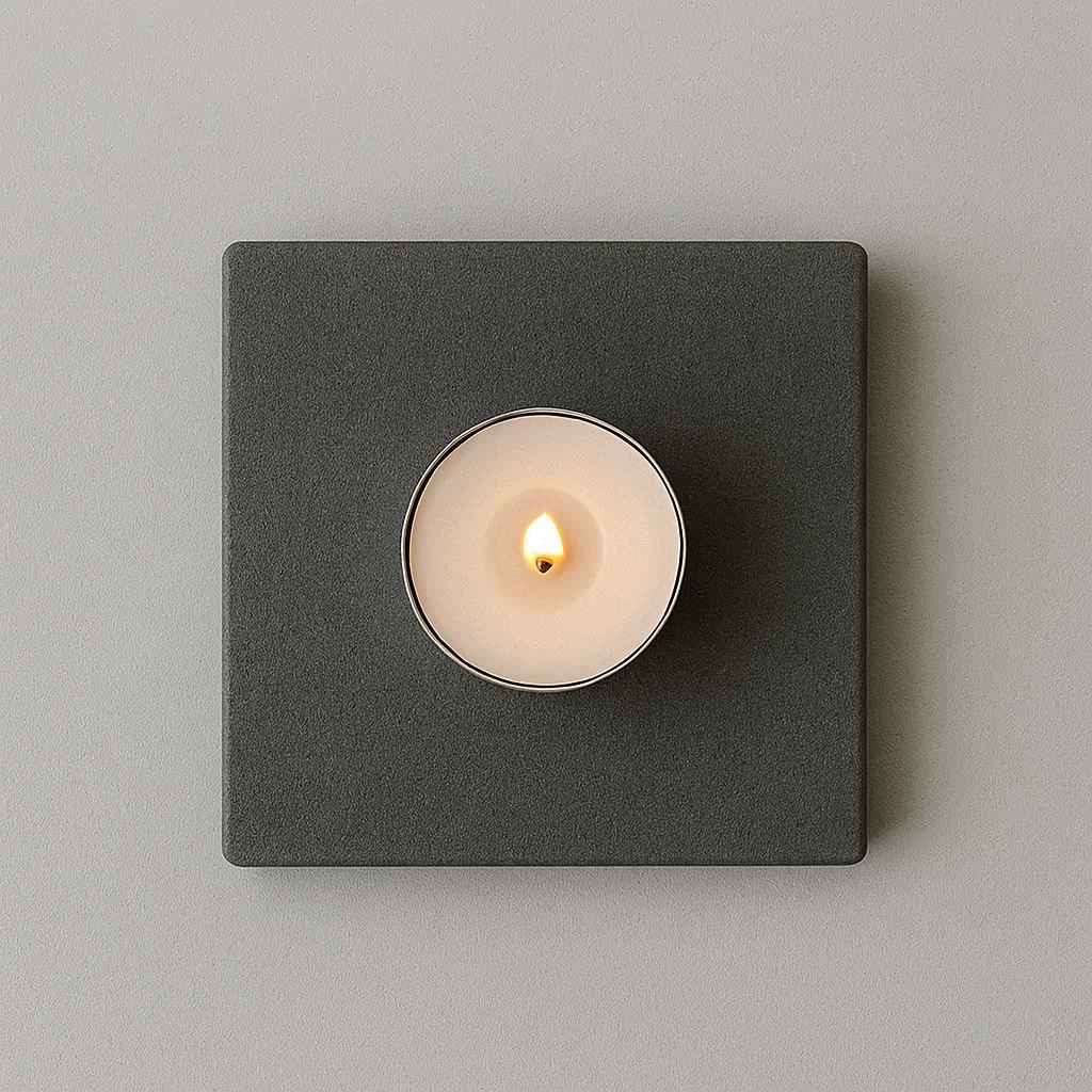 More than a holder, this is a shallow, handcrafted dish with a subtly textured, slate grey glaze. A small indentation in the center cradles a tea light, preventing wax drips. Its low-profile, organic shape is inspired by river stones. The warm, diffused light reflects off the glazed surface, creating a pool of radiance. Perfect for creating a calming, spa-like atmosphere on a bedside table or as part of a minimalist centerpiece arrangement.
